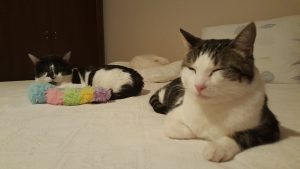 Naptime For the Boys. SpeedBump and Gabriel, with Mikimoto on the pillow in the background.