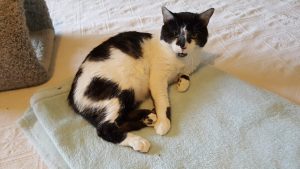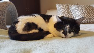 Two things I instinctively knew–I needed him to trust me, and he needed a safe place that was his alone. So I set up a wire crate in the guest bathroom with bedding, food, water, and pee pads. And I covered the crate with a sheet so he had privacy and a sense of safety. For the first few weeks, SpeedBump couldn’t care less where he was or what was going on. He was that messed up. By laying a hand towel over his face, I was able to lift him in and out of the crate to clean it and freshen his water and give him meds and sub-q fluids. I fed him Hill’s a/d mixed with Pedialyte through an eye dropper. He didn’t fight or object at all. The covered crate was his entire world for the first several weeks.
