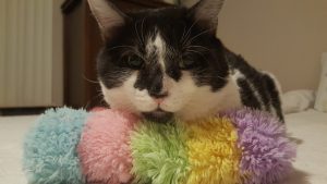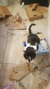 I filled the guest bathroom with toys and a big paper grocery bag, and in the beginning he was indifferent and ignored them. One evening when I got home from work and opened the bathroom door, I discovered the paper grocery bag shredded into little bits of confetti and covering every corner of the bathroom. SpeedBump had had a heyday.  After that, I gave him a fresh paper bag every day, and every night when I returned home, it was shredded like confetti. SpeedBump was learning to have fun. And another very special thing was happening as well–when I opened the bathroom door, SpeedBump was greeting me up close and personal. He didn’t run to his crate and hide anymore. My heart was over-the-moon happy and hopeful. I still was not allowed to reach for him, tho. We were still on his terms and still on his time frame. But that was okay–we were already leaps and bounds past where I thought we would ever get. He was rubbing up against my legs and sniffing me and purring up a storm. I couldn’t have asked for more.  He would walk across my feet and tell me all about his day. He’s a very talkative boy. And I very politely and happily listened to it all.  🙂