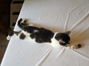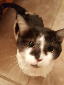 So now we have a nearly complete recovery, and a successful introduction with all of my pets. The only thing left is to encourage SpeedBump to let me touch him. For some reason, he has always warned me off trying to pet him. And I have remained respectful of his wishes. Over Thanksgiving weekend, when I had several days off work, I decided to test his feelings about it now. As he was rubbing up against my legs one morning, feeling all lovey dovey like he does, I leaned down and touched him. He jumped and pulled away. I held my position quietly with my hand out, and he studied me for a couple of minutes. Then I wiggled my fingers and spoke quietly to him. He thought about it a minute. And then he thought about it another minute. Then, like the light switch that flips on in a New York minute, he came back to me and started rubbing my hands, then laid on his back and asked for tickles. I started rubbing him head to toe, and he just let go of all his fears. In that split second, he said okay, we’re good now. He and I have been inseparable ever since. This cat is the biggest, most gentle, most loving and affectionate teddybear kitty I’ve ever had. All of my cats are very very loving, but this guy is crazy affectionate–as if he’s making up for lost years! He’s over the moon affectionate, like addicted and obsessive! It’s amazing to watch. We got our miracle!   🙂