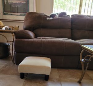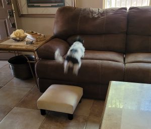 If these footstools have a downside, it would be that they can slide around on smooth flooring.  We have all tile flooring in our house, and it’s not an issue for Bandit when he’s launching himself off them.  This photo (below) is perfectly timed to show Bandit launching himself from the footstool to the sofa without the footstool slipping out from under him.