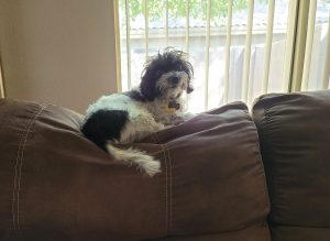 Then we found these dandy little footstools on Amazon.  Even though they’re not an actual pet product, they’re PERFECT!  They’re the ideal height and dimensions for the pet’s use, yet small enough to be out of the family’s way so you don’t have to shove them under the sofa at all.  Another very important detail is they’re super cushioned, which softens the impact to your pet’s joints.  Plus they’re actual furniture, so they naturally blend in with your decor.  Last but not least, they’re super affordable, so we bought several to put all around the house.  They come in faux suede, faux leather, or fabric, and also in different colors and patterns.  Bandit took to them right away and is LOVING them!  Took him all of five minutes to learn to use them.  All-around great little find!