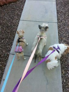 Begin walking casually toward each other, keeping leads loose–no tension. If you hold your dog’s lead tight, he’ll know right away something’s not right and his response will be to protect you against the threat. Stay calm, stay loose. DON’T comfort him as you’re walking. if you’re petting him and telling him everything’s going to be okay, that’s also telling him there’s something to fear up ahead. Pretty much just ignore the dogs as you walk toward each other.