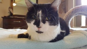 So now we have a nearly complete recovery, and a successful introduction with all of my pets. The only thing left is to encourage SpeedBump to let me touch him. For some reason, he has always warned me off trying to pet him. And I have remained respectful of his wishes. Over Thanksgiving weekend, when I had several days off work, I decided to test his feelings about it now. As he was rubbing up against my legs one morning, feeling all lovey dovey like he does, I leaned down and touched him. He jumped and pulled away. I held my position quietly with my hand out, and he studied me for a couple of minutes. Then I wiggled my fingers and spoke quietly to him. He thought about it a minute. And then he thought about it another minute. Then, like the light switch that flips on in a New York minute, he came back to me and started rubbing my hands, then laid on his back and asked for tickles. I started rubbing him head to toe, and he just let go of all his fears. In that split second, he said okay, we’re good now. He and I have been inseparable ever since. This cat is the biggest, most gentle, most loving and affectionate teddybear kitty I’ve ever had. All of my cats are very very loving, but this guy is crazy affectionate–as if he’s making up for lost years! He’s over the moon affectionate, like addicted and obsessive! It’s amazing to watch. We got our miracle!   🙂