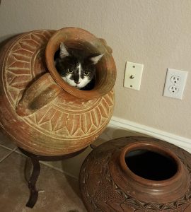 The only time I put him and his crate back in the guest room now was when I had to work. When I was at home, SpeedBump and his crate were in the same room with us. To my happy surprise, he was enjoying being a part of the family. He was fully engaged and watching every little thing. He even started playing with his toys. And then he meowed his first meow. My heart sang when I heard that meow–it was my first real sign that there was hope after all for SpeedBump to become a member of our family. The only time SpeedBump would meow was when he was not with us. He was quiet and content as long as he was in the same room. He even began meowing his objection in the mornings when I moved him back to the guest bathroom so I could leave for work.