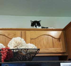 It had been four months that SpeedBump lived in his safe space, the crate. Staying mindful that he sets the pace, not me, I decided to push just a little and start blending him with us. I put the dogs out in the kennel and closed all my cats in the pet room where they couldn’t be seen. I walked over to SpeedBump’s crate in the middle of the living room and opened the door … and walked away. It was up to SpeedBump what he wanted to do next. I moved to the bar between my dining room and living room so as not to intimidate him from venturing out. It took only a moment, when this little black and white kitty wandered curiously by. SpeedBump was exploring.  🙂